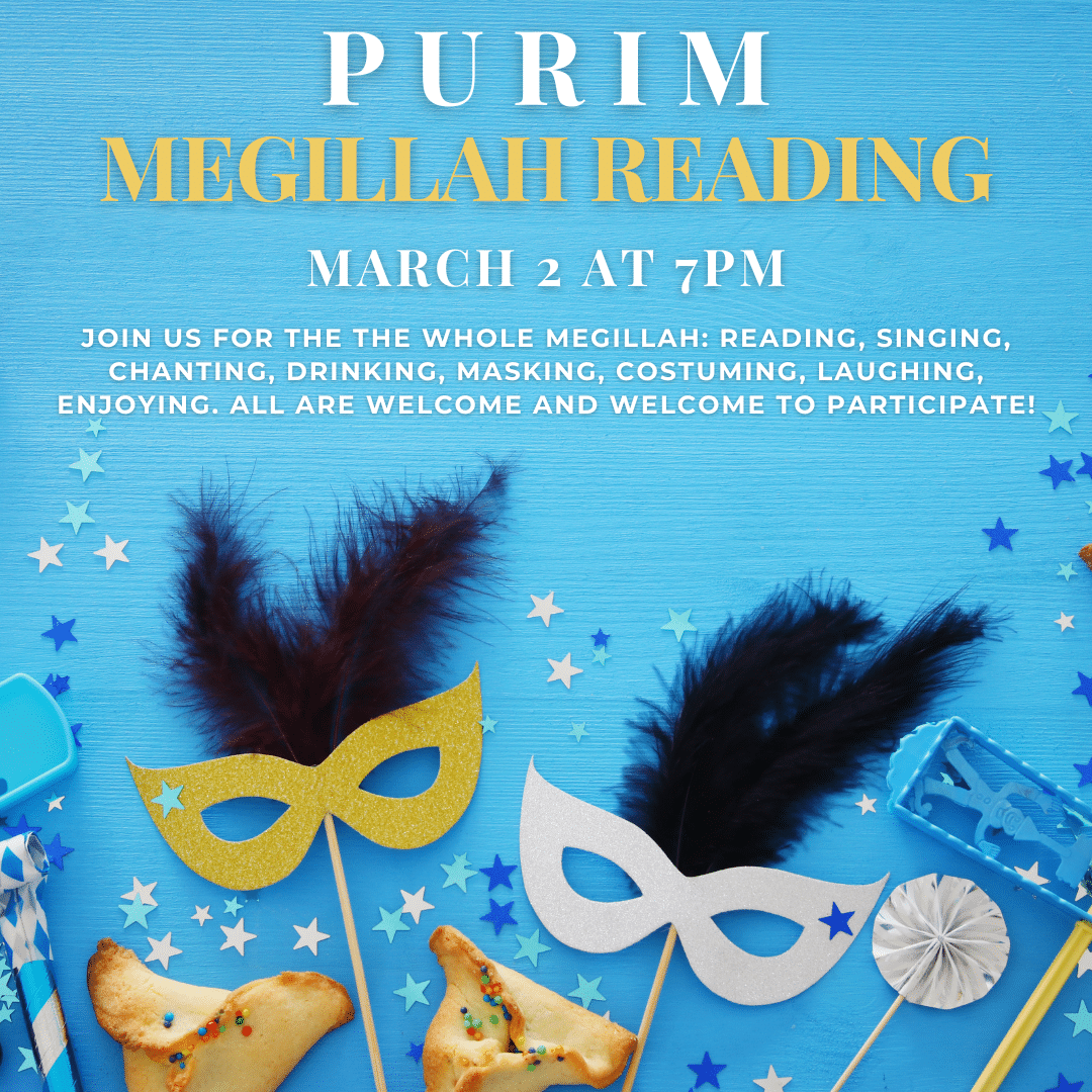 Join us for the the whole Megillah: reading, singing, chanting, drinking, masking, costuming, laughing, enjoying. All are welcome and welcome to participate! Contact Cantor Schloss if you’d like to join in the reading/singing.