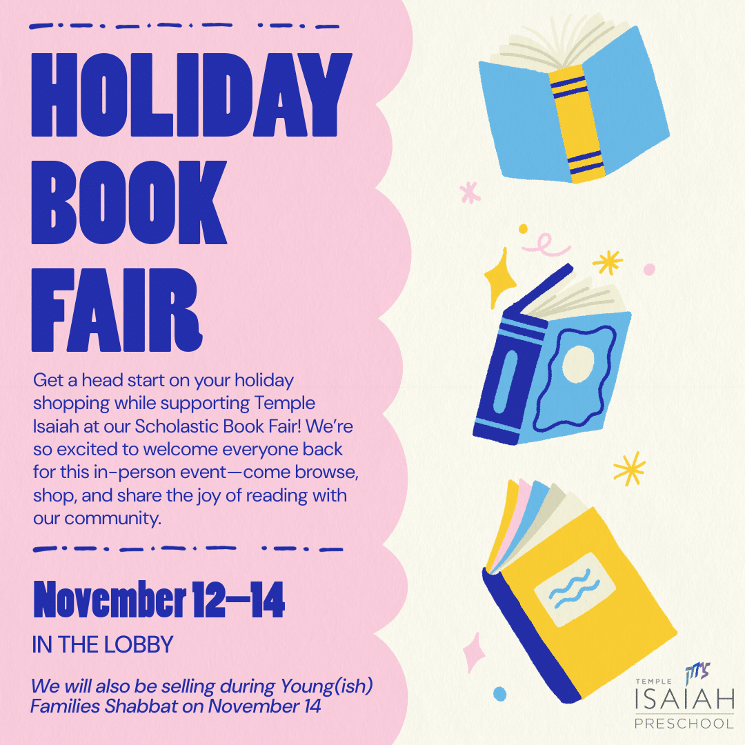 Get a head start on your holiday shopping while supporting Temple Isaiah at our Scholastic Book Fair! We’re so excited to welcome everyone back for this in-person event—come browse, shop, and share the joy of reading with our community.