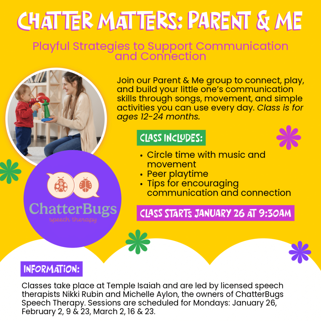 The ChatterMatters Parent & Me group is a fun and interactive class for toddlers ages 12–24 months and their caregivers. This group designed to help you connect, play, and spark your little one’s communication skills through songs, movement, and play.