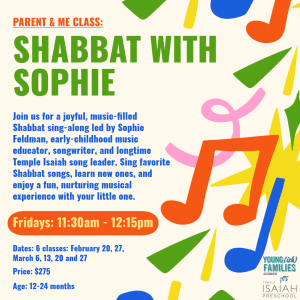 Join us for a joyful, music‑filled Parent & Me Shabbat song experience led by Sophie Feldman, early‑childhood music educator, songwriter, and producer. With years of experience as Temple Isaiah’s song leader and preschool music specialist, a background in developmental psychology, and formal training from the USC Thornton School of Music, Teacher Sophie creates a class environment that is as nurturing as it is musical. Come sing your favorite Shabbat songs and learn some new ones, while bonding with your little one and having some fun. RSVP HERE